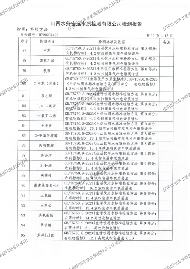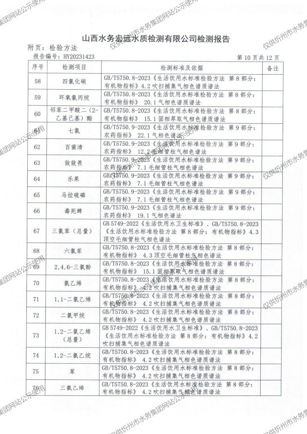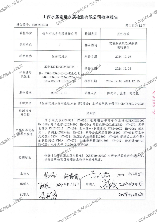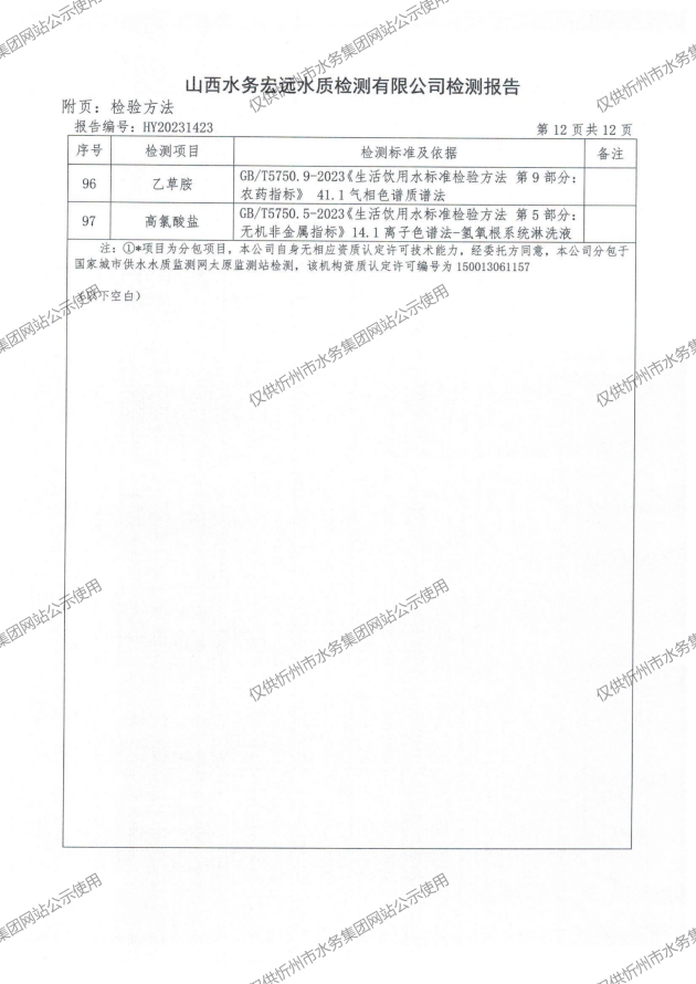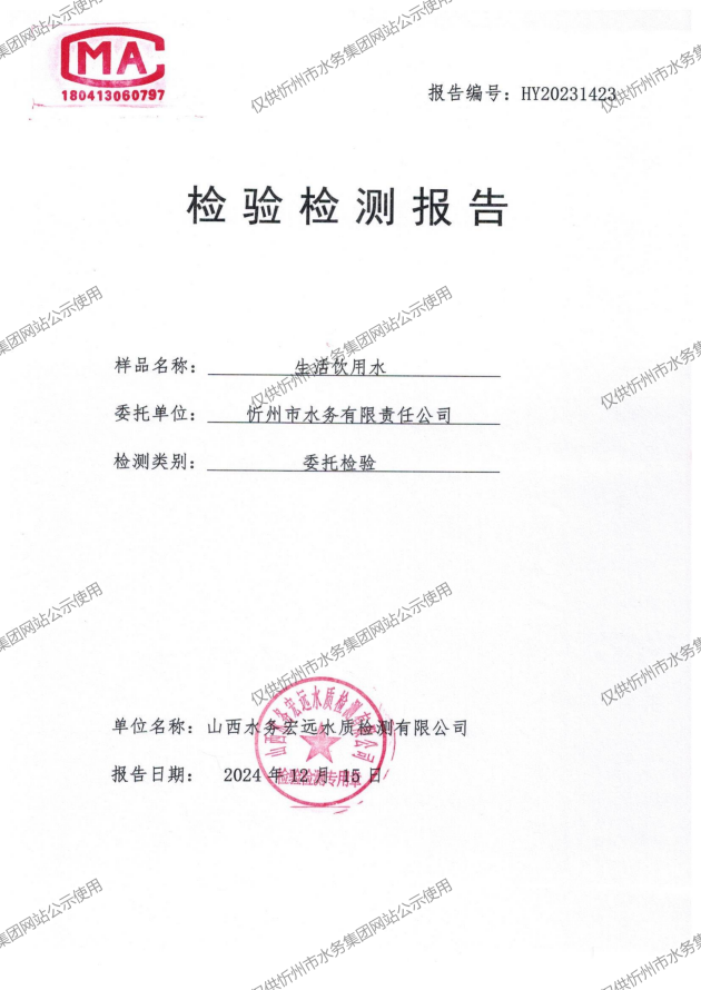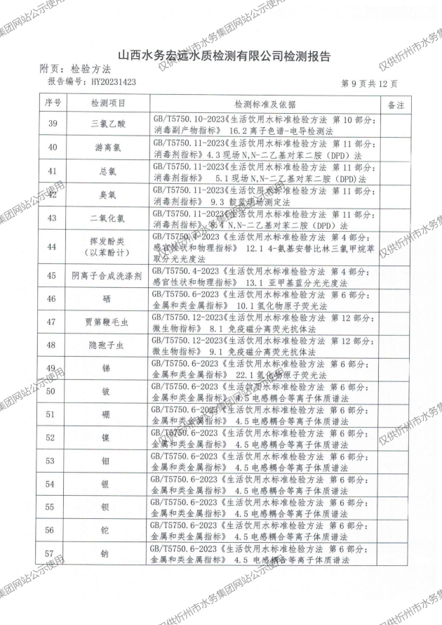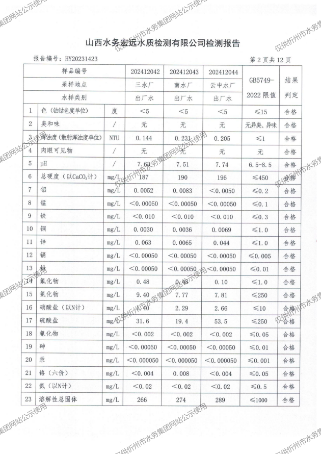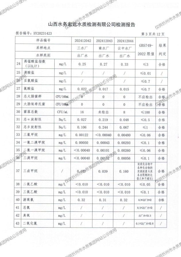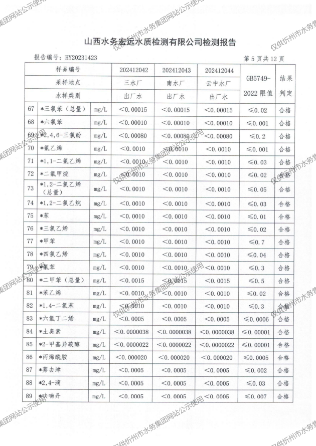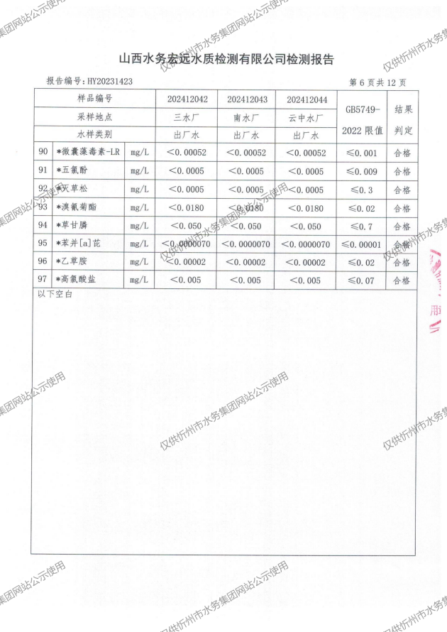 2024年忻州城區公共供水南水廠、三水廠、云中水廠出廠水97項水質全分析