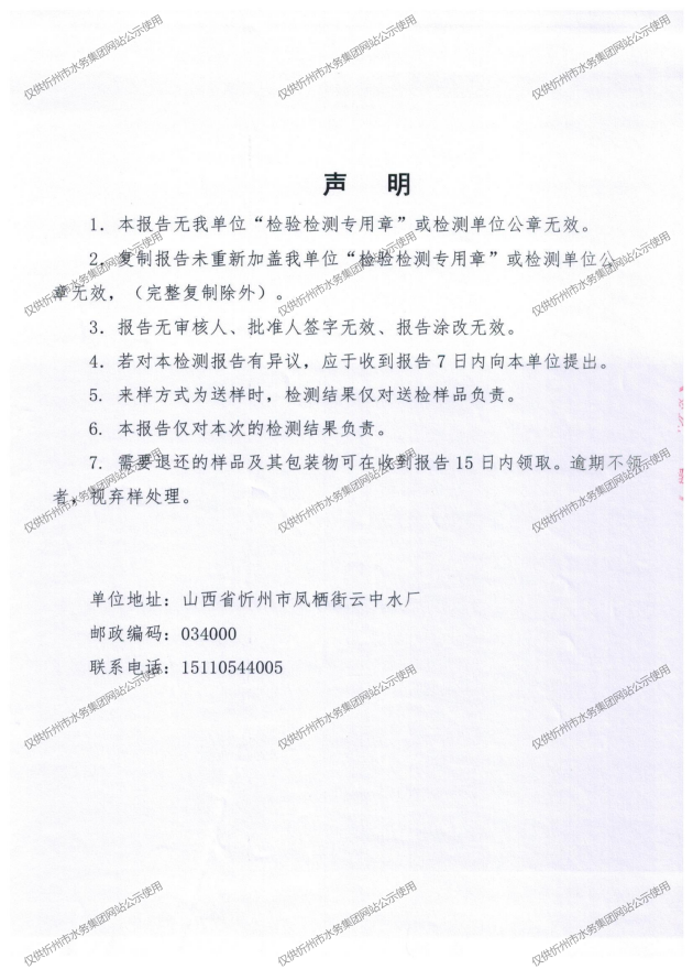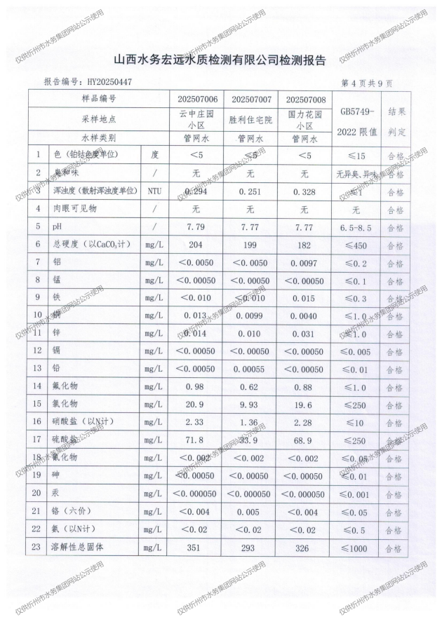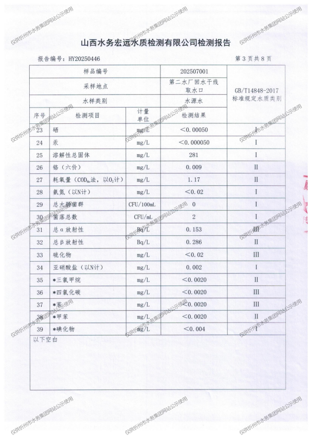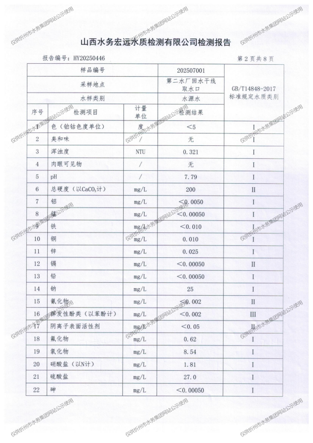 忻州城區公共供水水源水、出廠水、管網水、管網末梢水2025年7月份水質信息公示